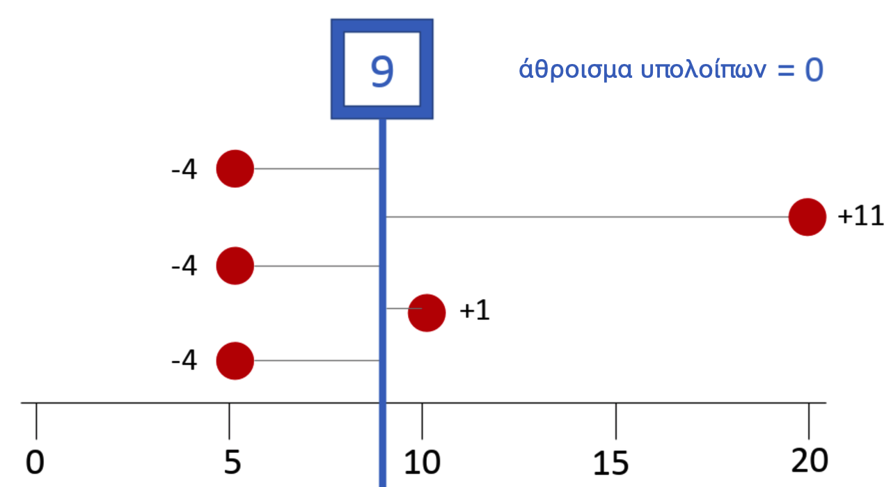 Για να υπολογίσουμε τον αριθμητικό μέσο όρο αυτής της κατανομής, απλώς προσθέτουμε όλους τους αριθμούς στο δείγμα, και στη συνέχεια διαιρούμε με το μέγεθος του δείγματος, που είναι 5. Έτσι, ο μέσος όρος αυτής της κατανομής είναι 9. Τόσο ο μέσος όρος όσο και η διάμεσος είναι δείκτες του πού βρίσκεται το κέντρο της κατανομής, αλλά ορίζουν το «κέντρο» με διαφορετικούς τρόπους: το 5 και το 9 αντιπροσωπεύουν πολύ διαφορετικά σημεία σε αυτή την κατανομή.