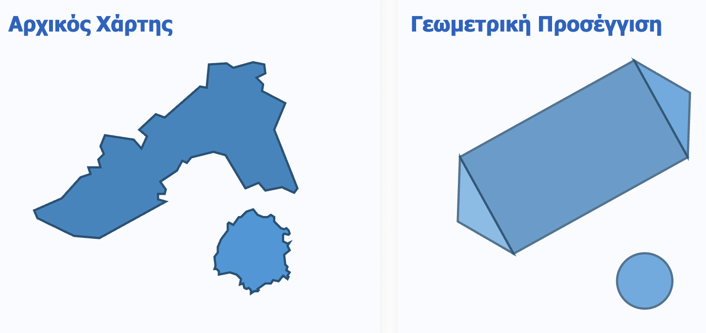 Ας πάμε την αναλογία λίγο παραπέρα. Αφότου έχουμε αποφασίσει να μοντελοποιήσουμε το εμβαδόν του Ν. Καβάλας με ένα ορθογώνιο, δύο τρίγωνα και έναν κύκλο, προσπαθούμε να κάνουμε το μοντέλο να προσαρμοστεί όσο καλύτερα γίνεται στον αρχικό χάρτη. Για να το κάνουμε αυτό προσαρμόζουμε το μέγεθος και τον προσανατολισμό των γεωμετρικών σχημάτων. Ακολουθούν δύο άλλα παραδείγματα.