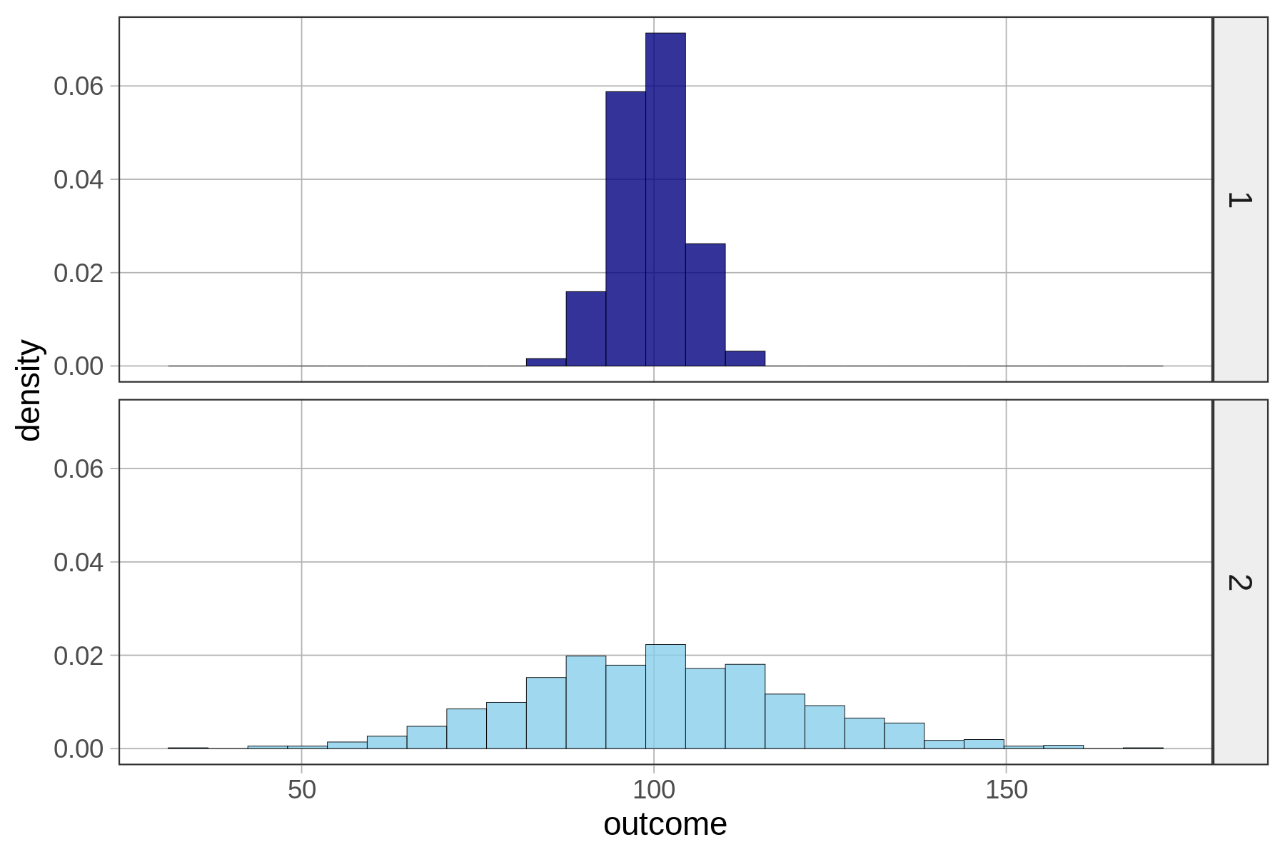 Ας εστιάσουμε μόνο σε κατανομές ποσοτικών μεταβλητών. Ρίξτε μια ματιά στις δύο παρακάτω κατανομές για τις μεταβλητές 1 και 2.