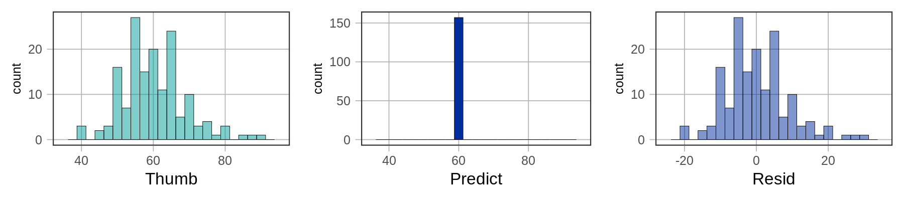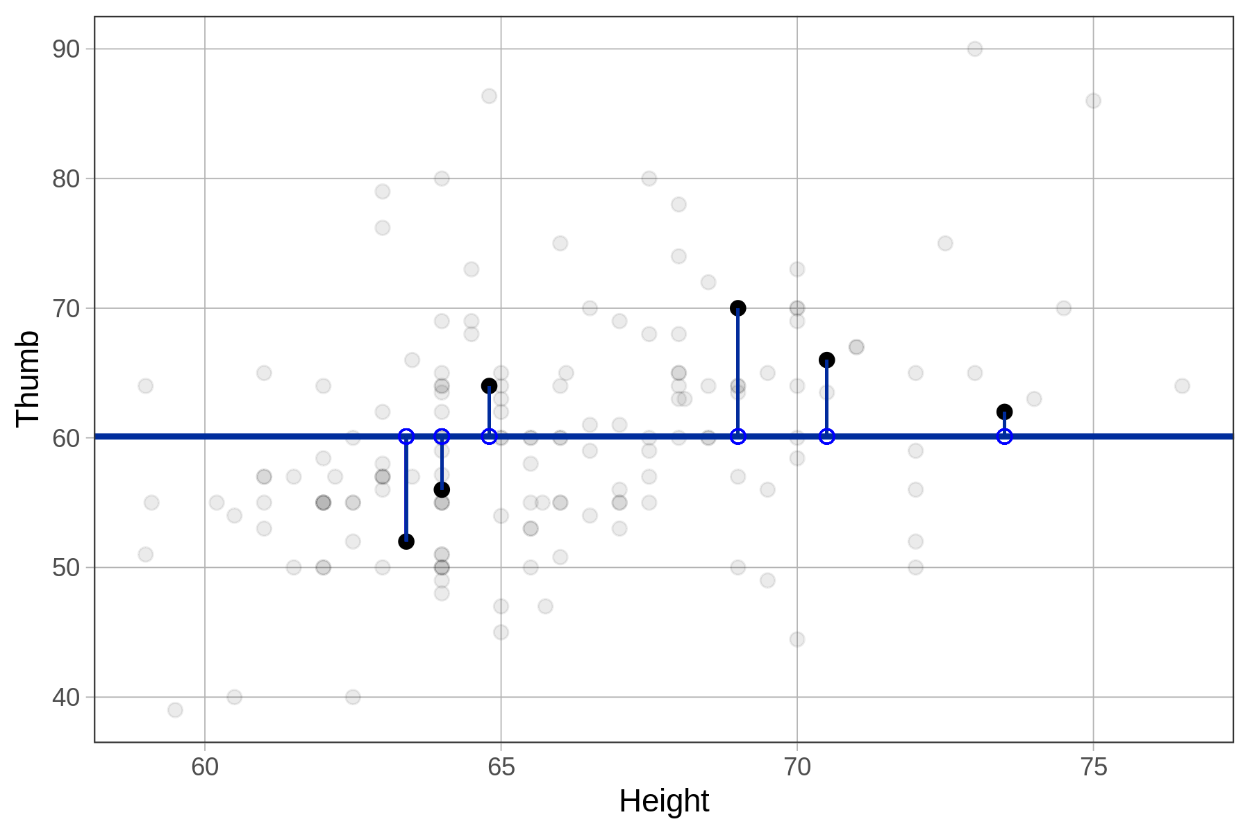 Ένας μόνο αριθμός—ακόμα και ένας καλά επιλεγμένος αριθμός—δεν είναι ένα πολύ καλό μοντέλο. Μπορεί να είναι ένα καλύτερο μοντέλο για τη μεταβλητή 1 από ό,τι για τη μεταβλητή 2 παραπάνω, αλλά εξακολουθεί να μην είναι πολύ καλό. Οι περισσότερες τιμές δεν είναι ίδιες με την τιμή που επιλέγουμε ως μοντέλο.