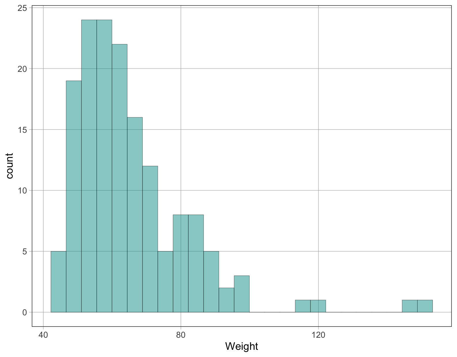 Ποια τιμή θα επιλέγατε για να αναπαραστήσετε ή να μοντελοποιήσετε την παραπάνω κατανομή του βάρους (