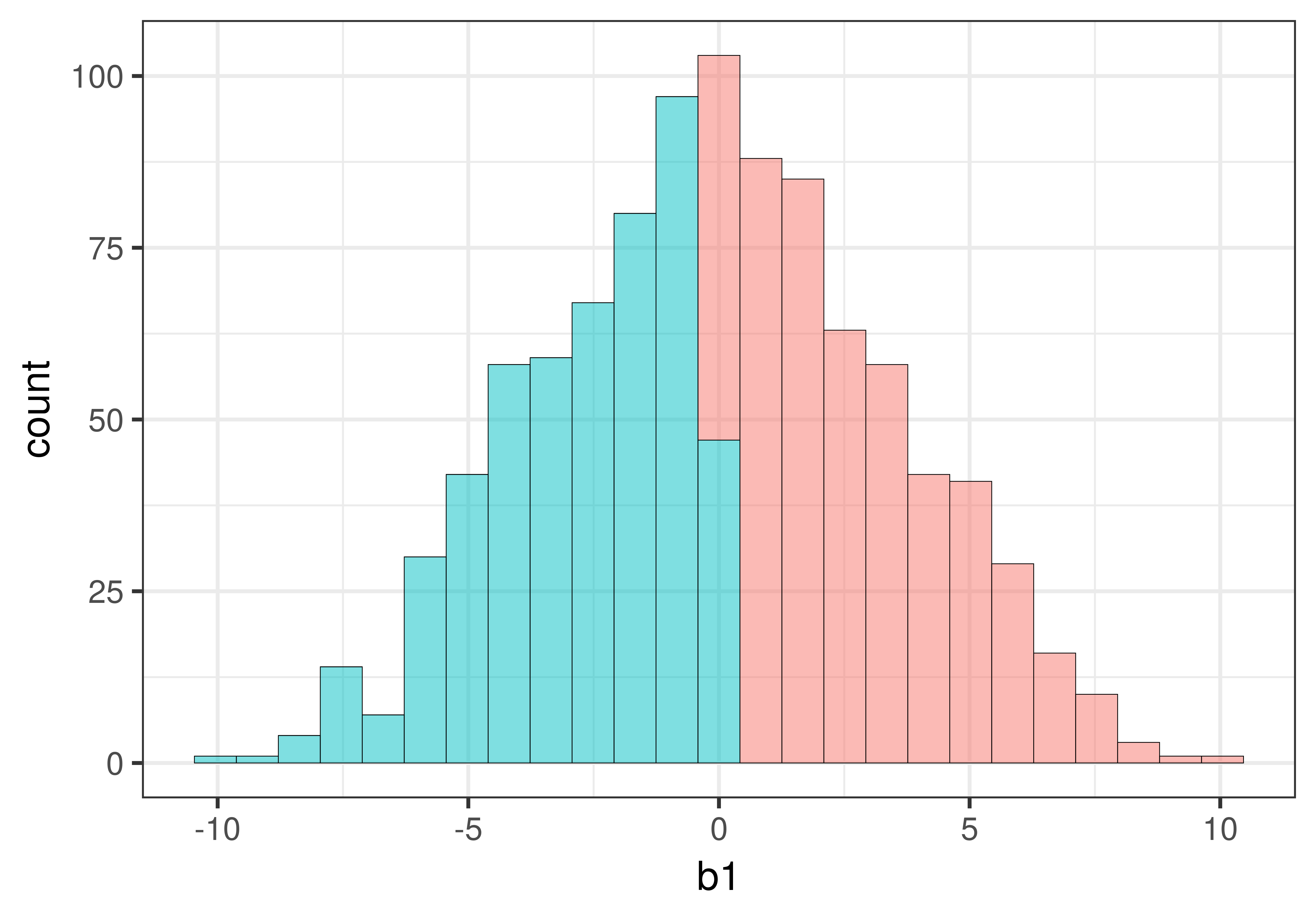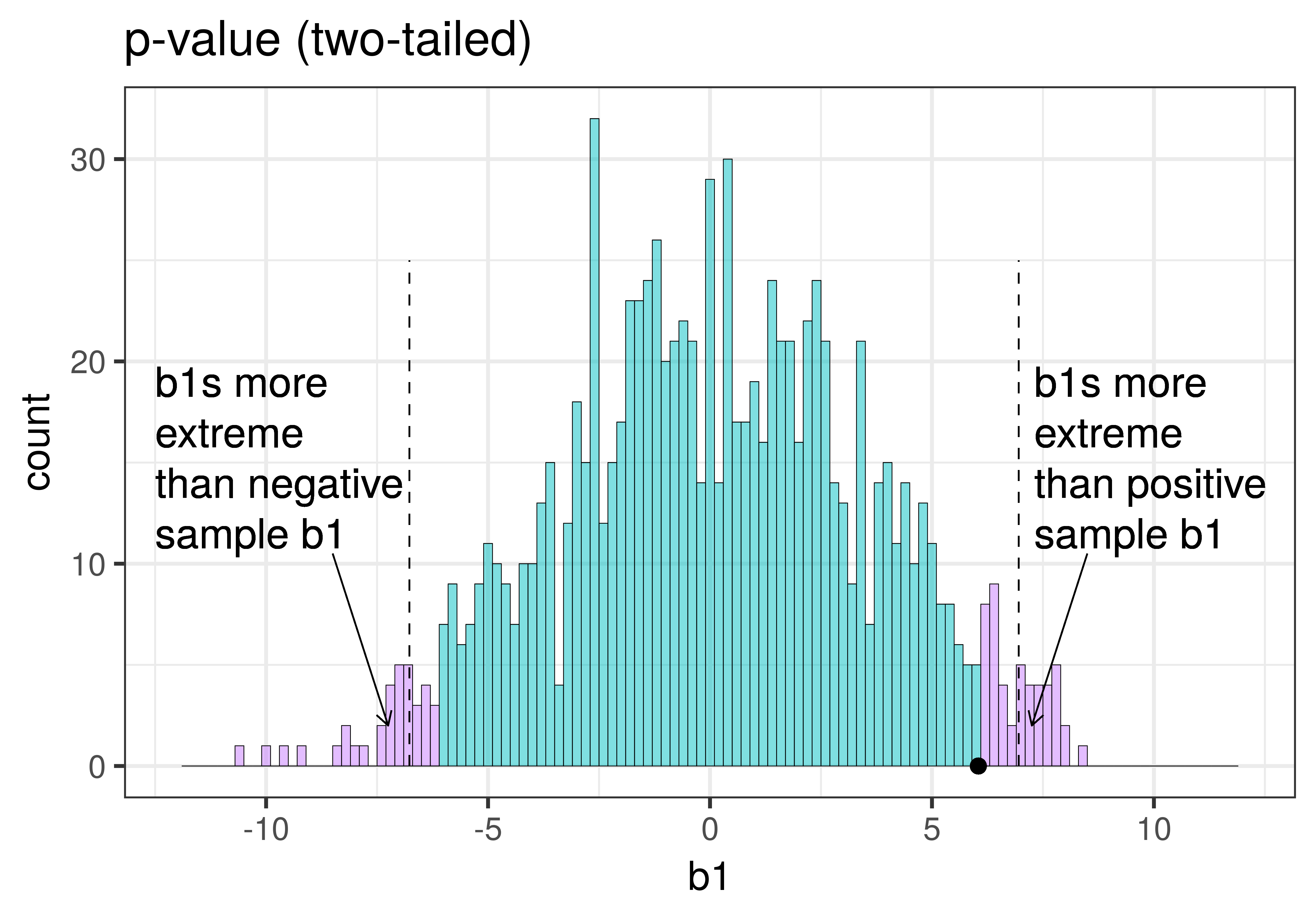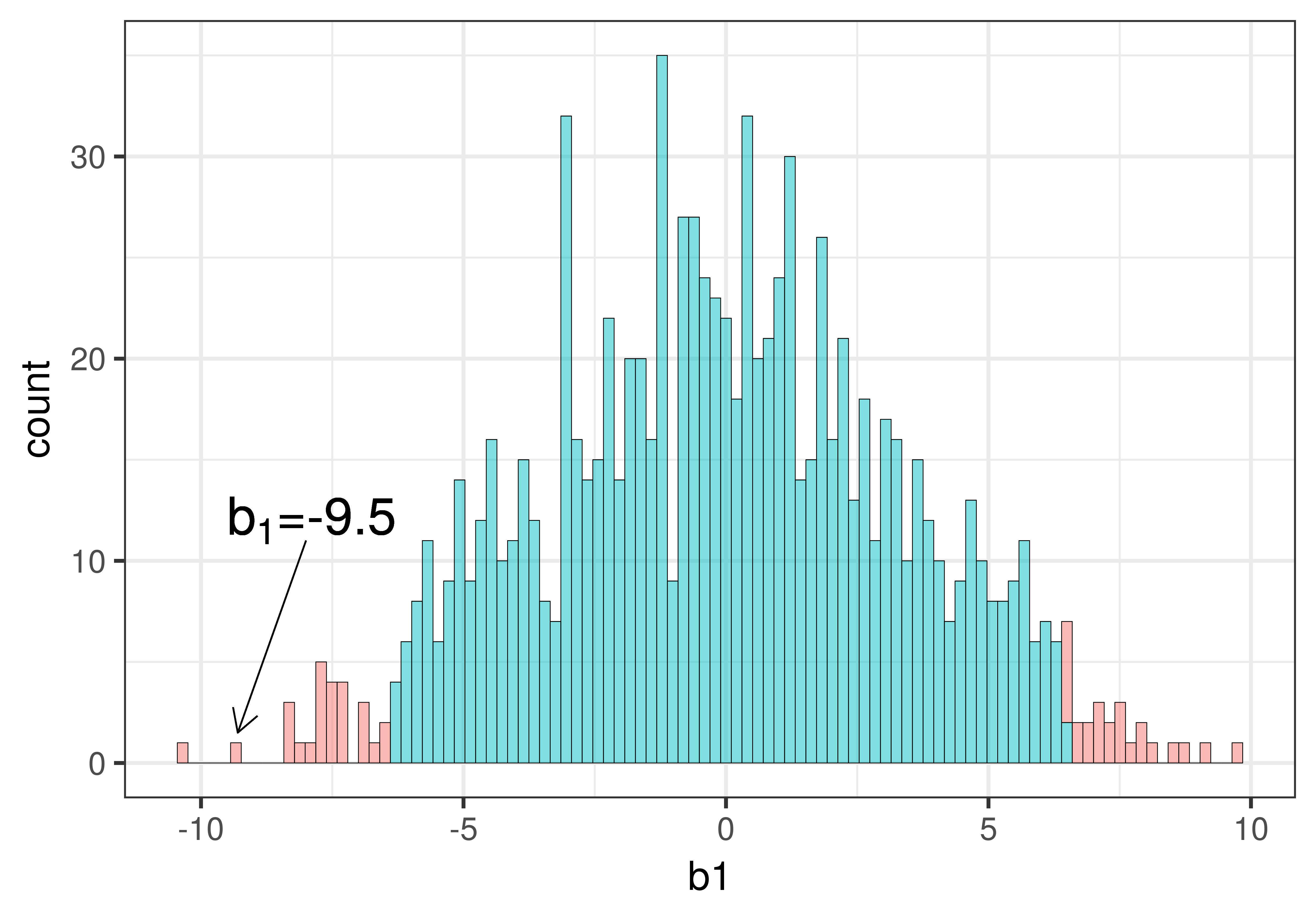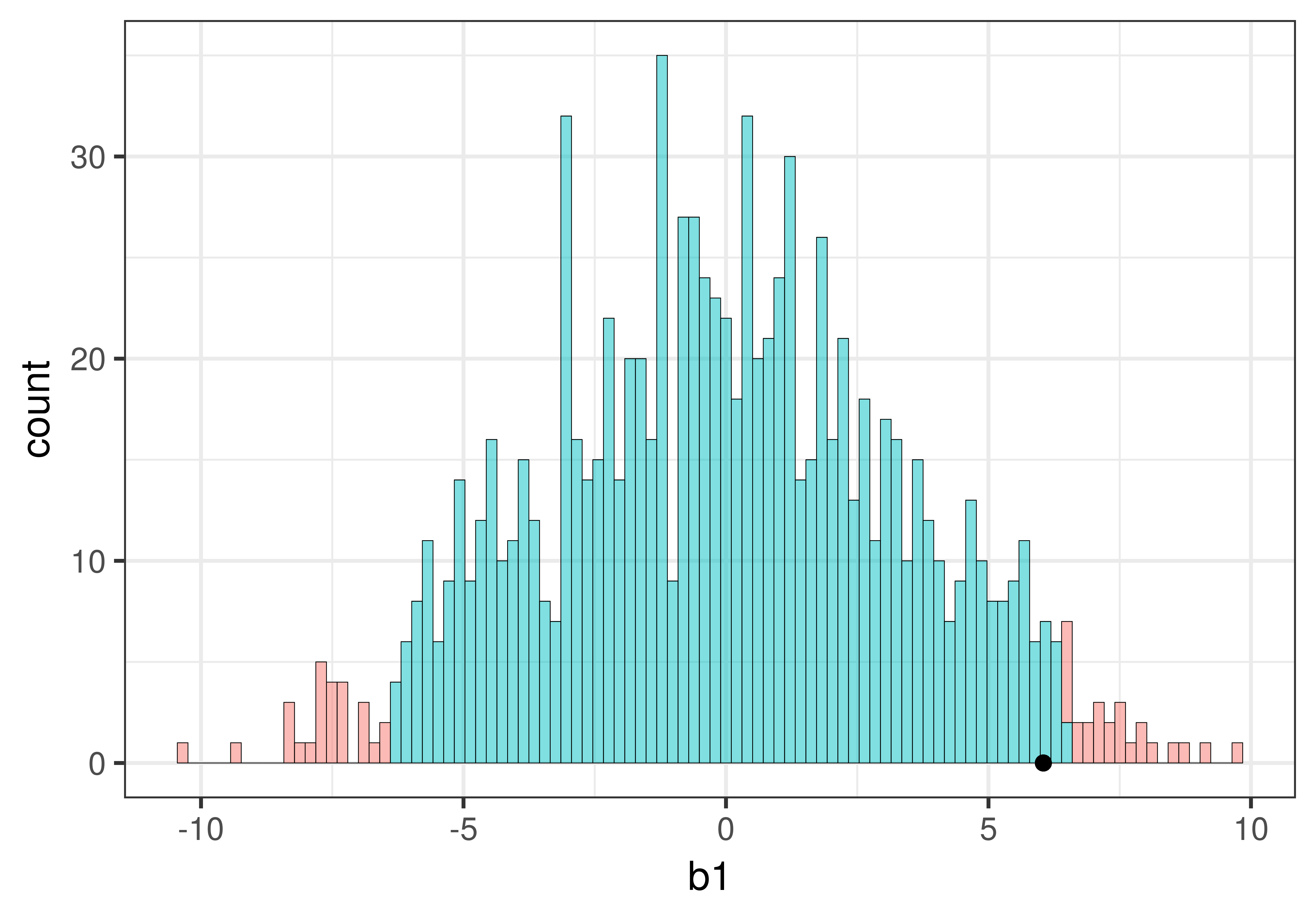 Η τιμή \(p\) είναι η πιθανότητα να πάρουμε μια τιμή \(b_1\) τόσο ακραία ή πιο ακραία από \(-10\). Επειδή το \(-10\) είναι πιο ακραίο από σχεδόν όλες τις προσομοιωμένες τιμές: