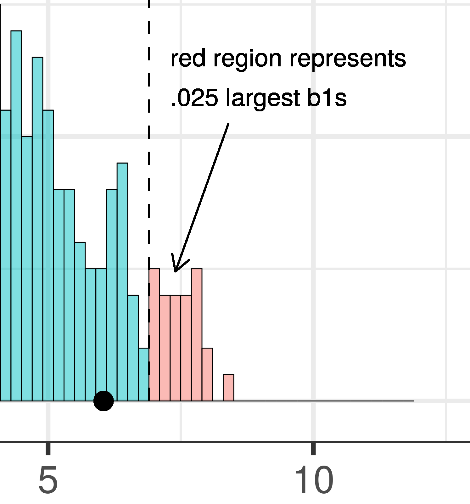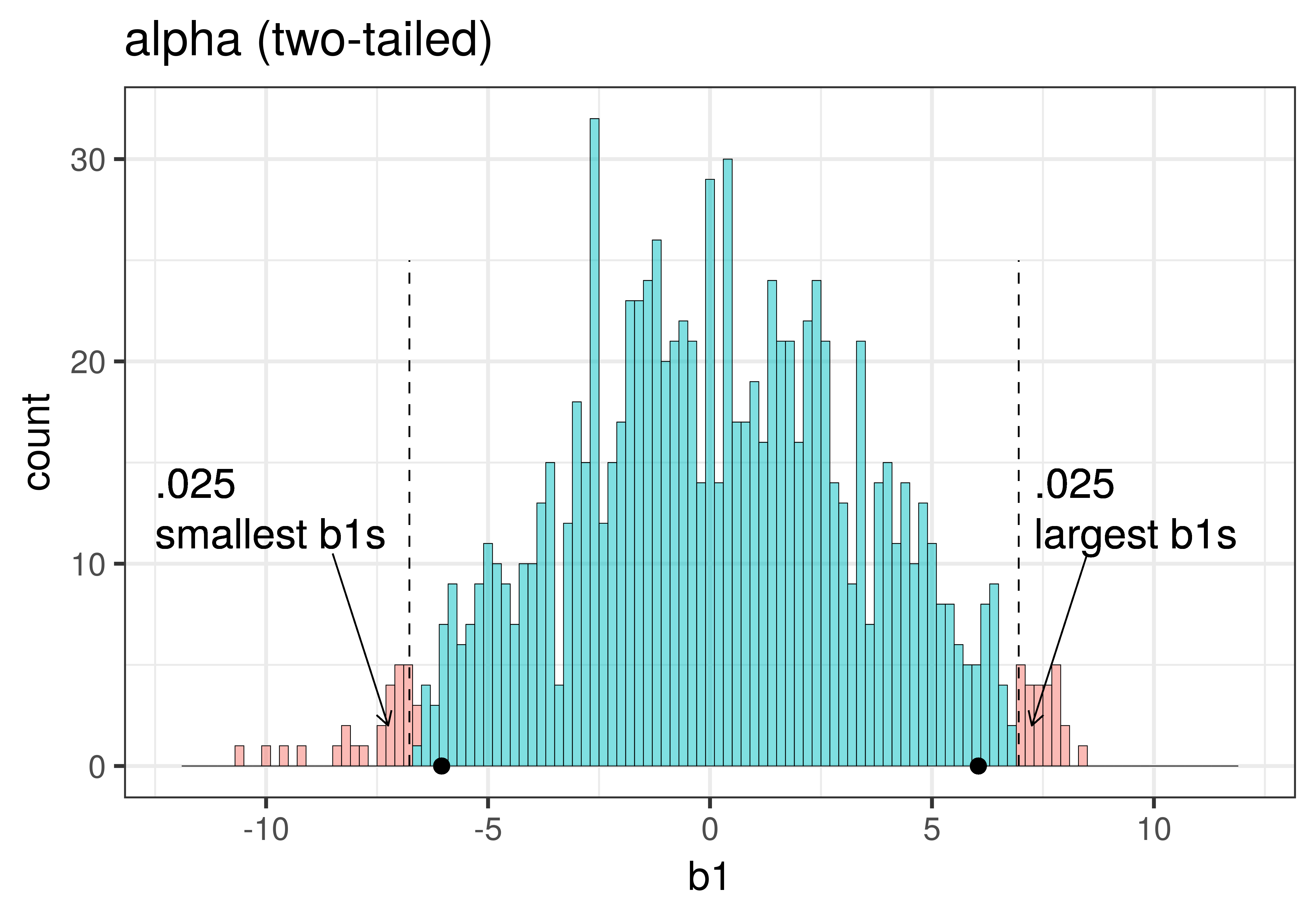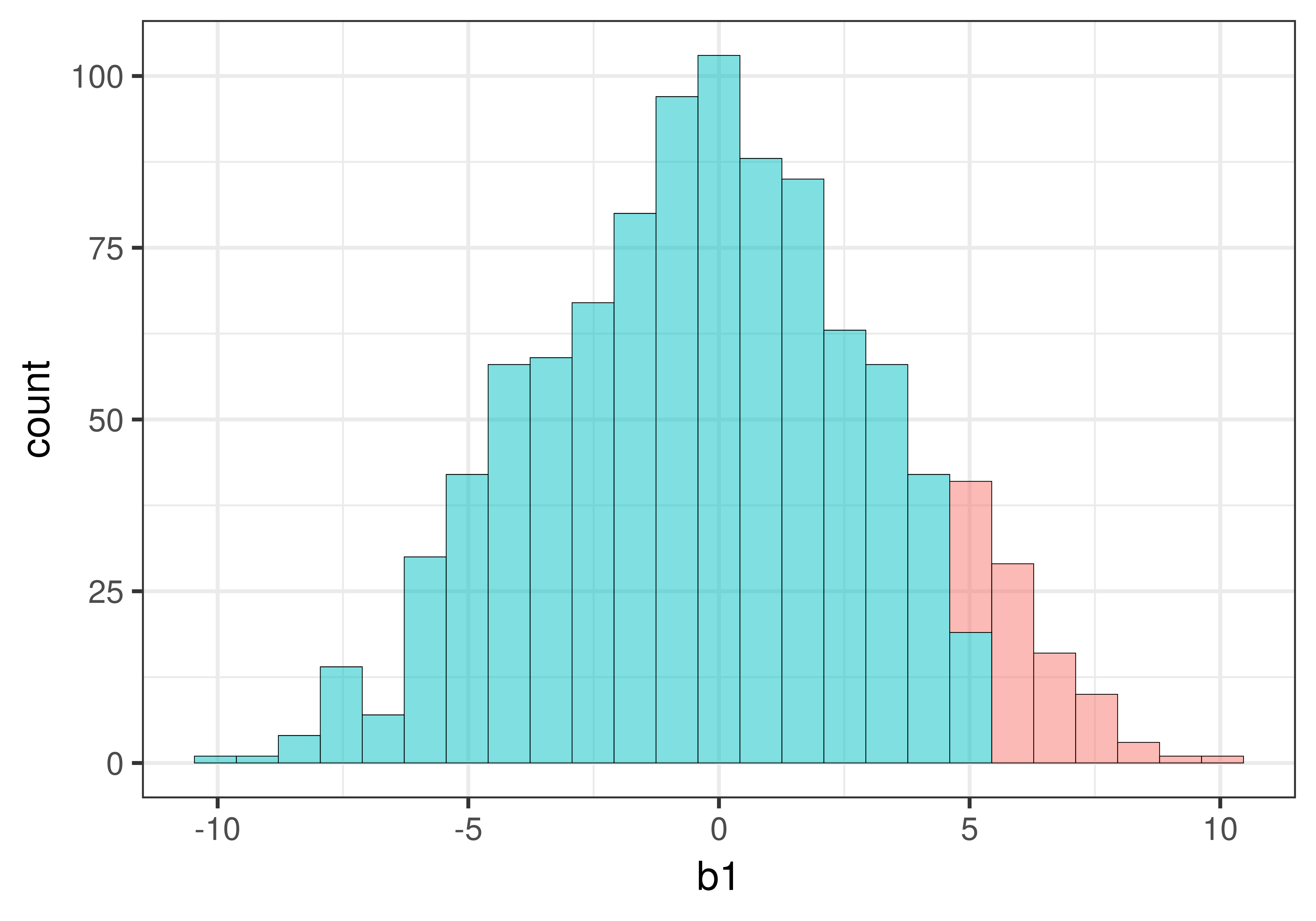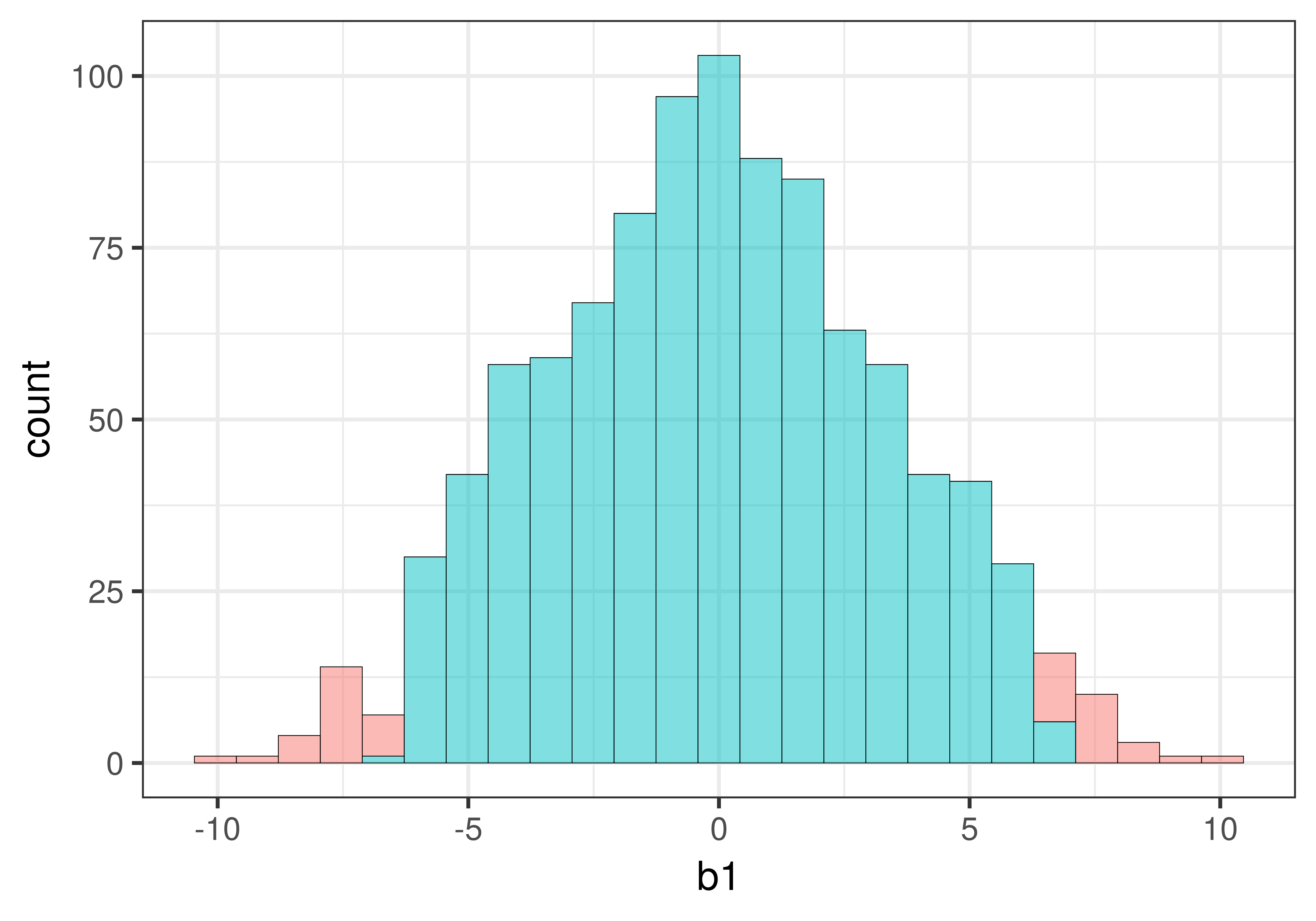Η τιμή \(p\) είναι η πιθανότητα να πάρουμε μια τιμή \(b_1\) τόσο ακραία ή πιο ακραία από \(-10\). Επειδή το \(-10\) είναι πιο ακραίο από σχεδόν όλες τις προσομοιωμένες τιμές: