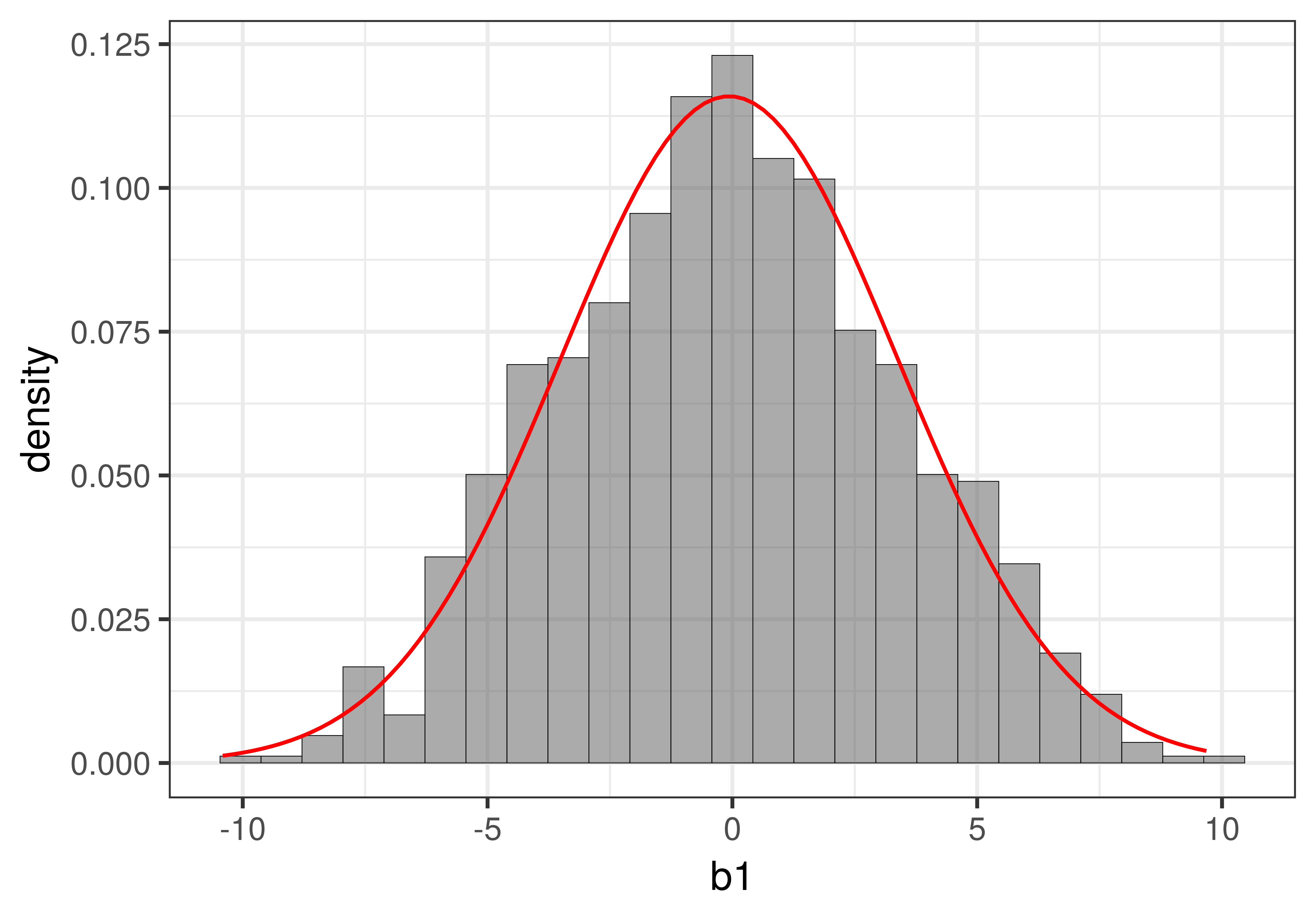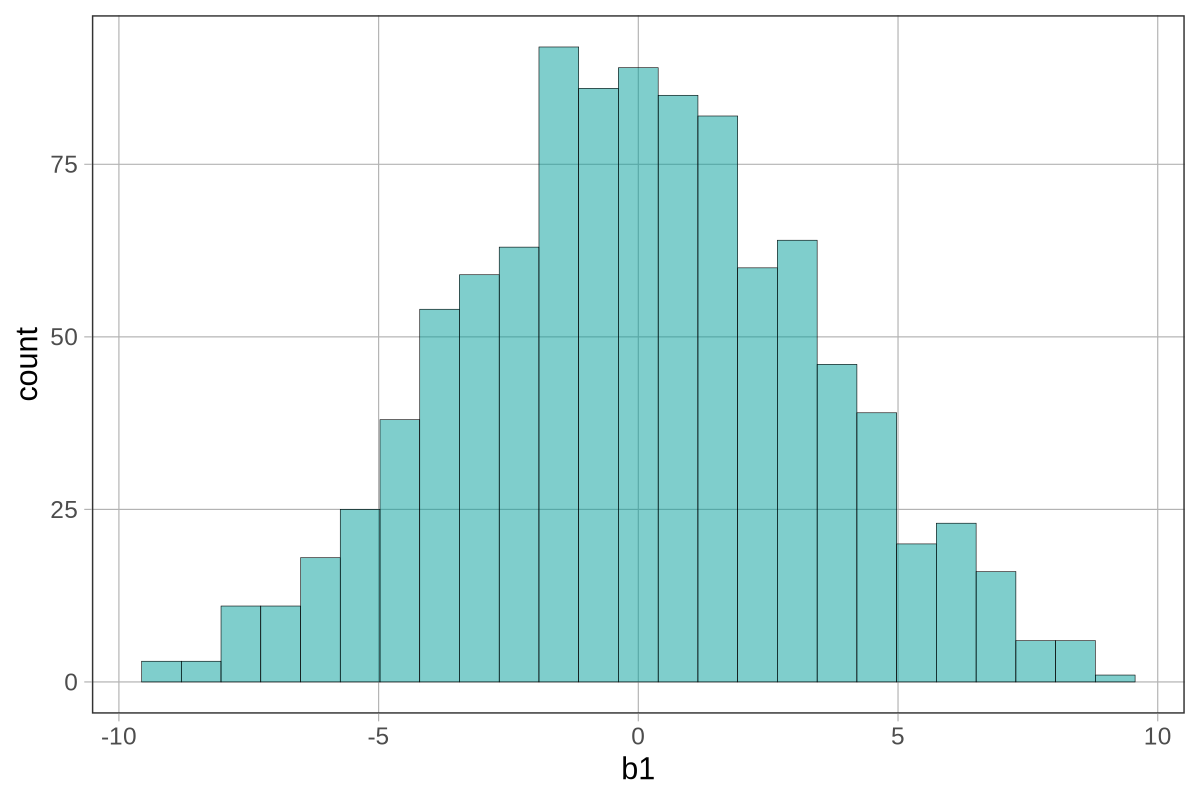 Αν \(\beta_1 = 0\) είναι αληθές, τότε θα περιμέναμε οι δειγματικές εκτιμήσεις \(b_1\) να είναι κοντά στο 0 (με κάποια τυχαία μεταβλητότητα γύρω από το 0).