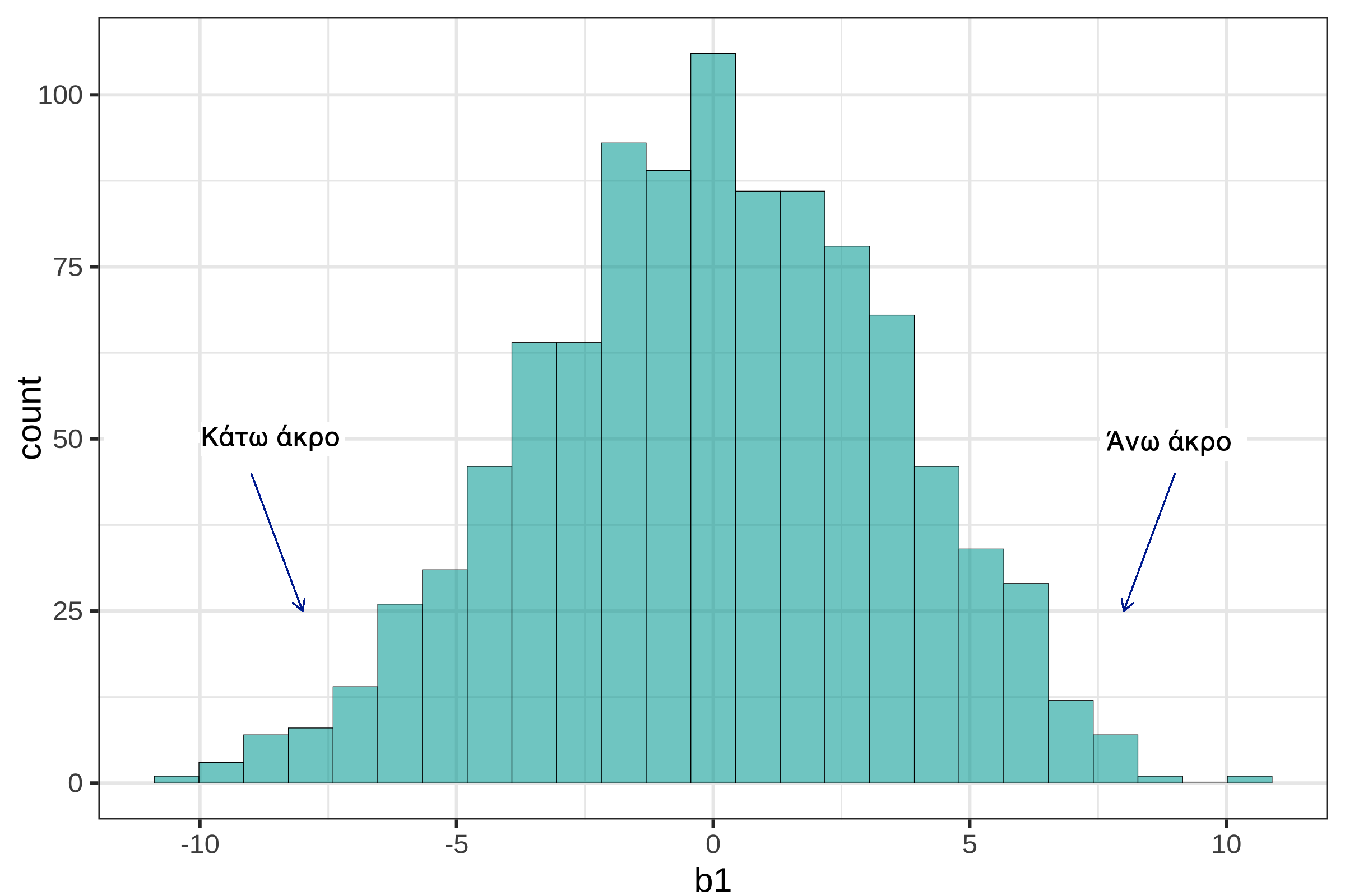 11. Στο παραπάνω ιστόγραμμα, ποια από τις ακόλουθες τιμές του \(b_1\) θα θεωρούνταν «απίθανη»;