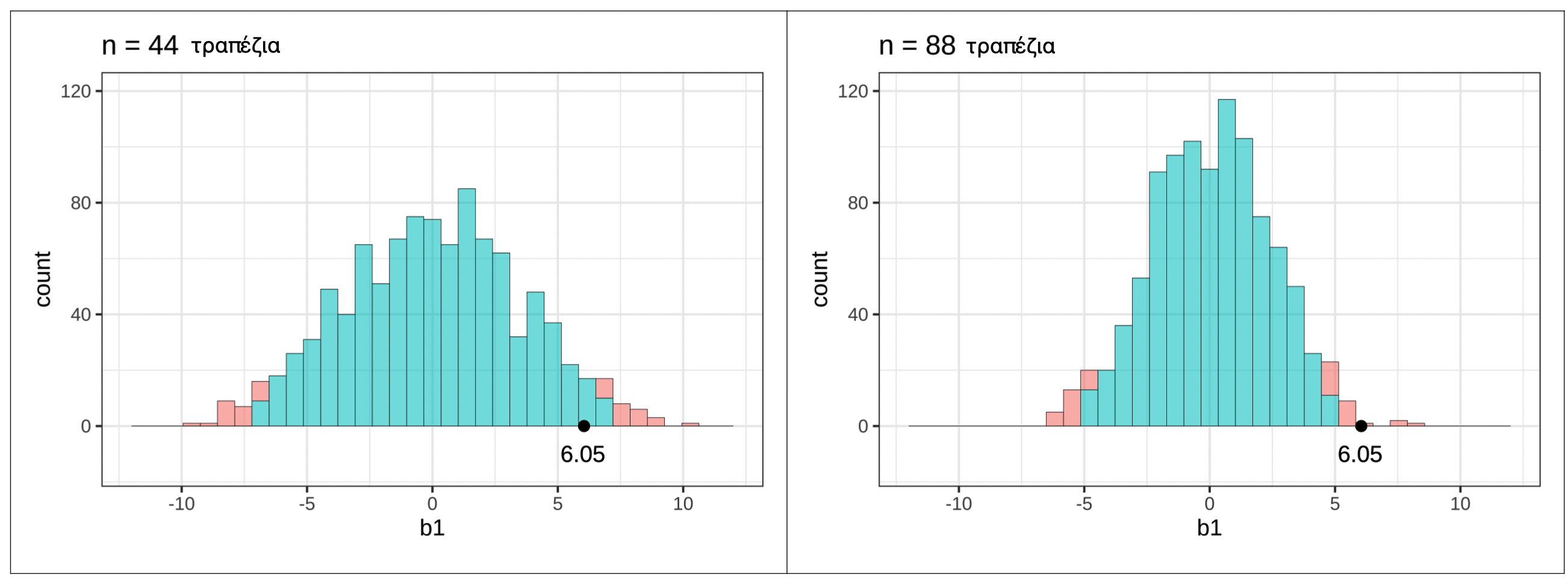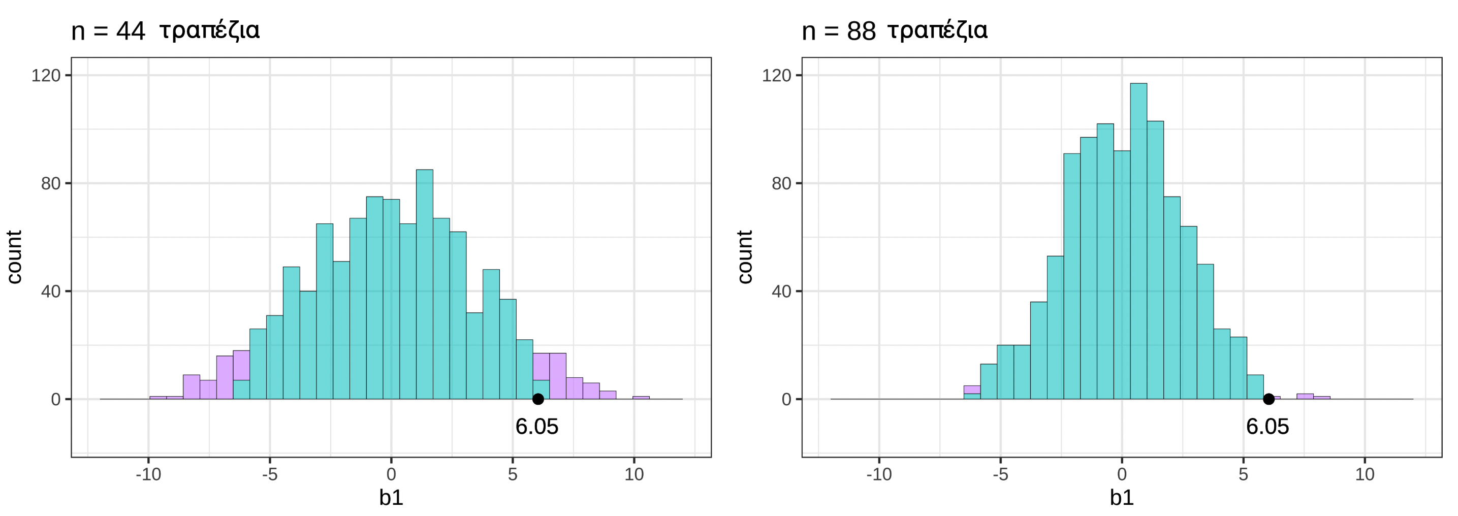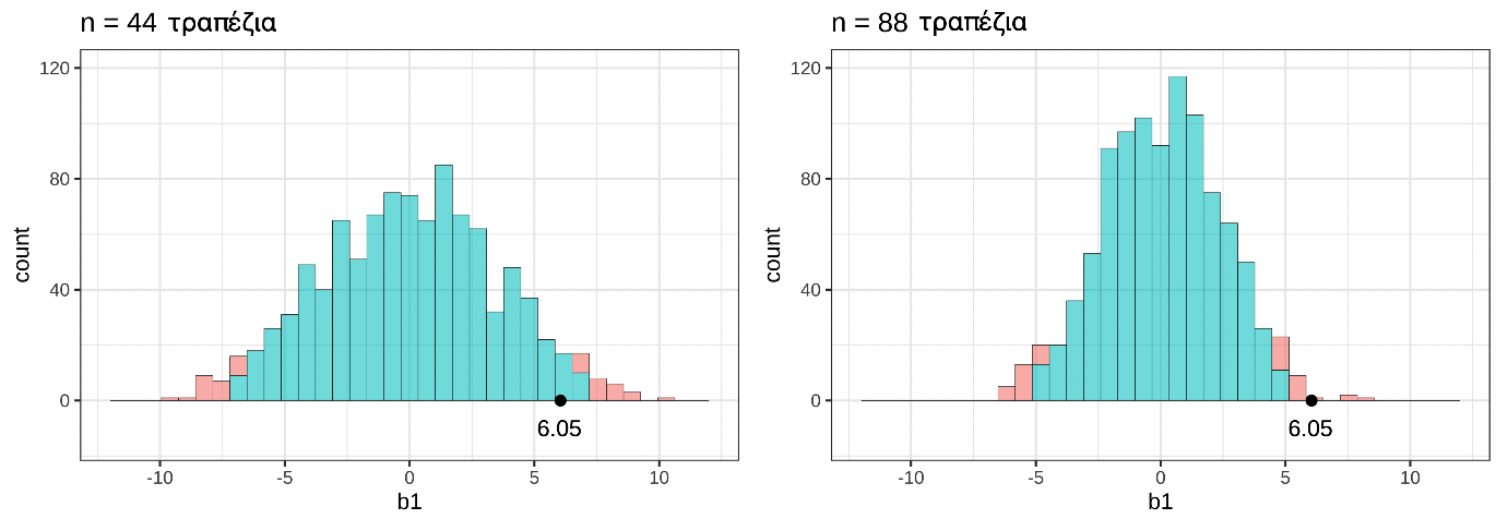 Β. «ΔΠΔ όπου \(\beta_1 = -9.76\)»: Το \(-9.76\) είναι το δειγματικό\(b_1\) που παρατηρήσαμε στα πραγματικά δεδομένα. Η προσομοίωση υποθέτει \(\beta_1 = 0\), όχι \(-9.76\).