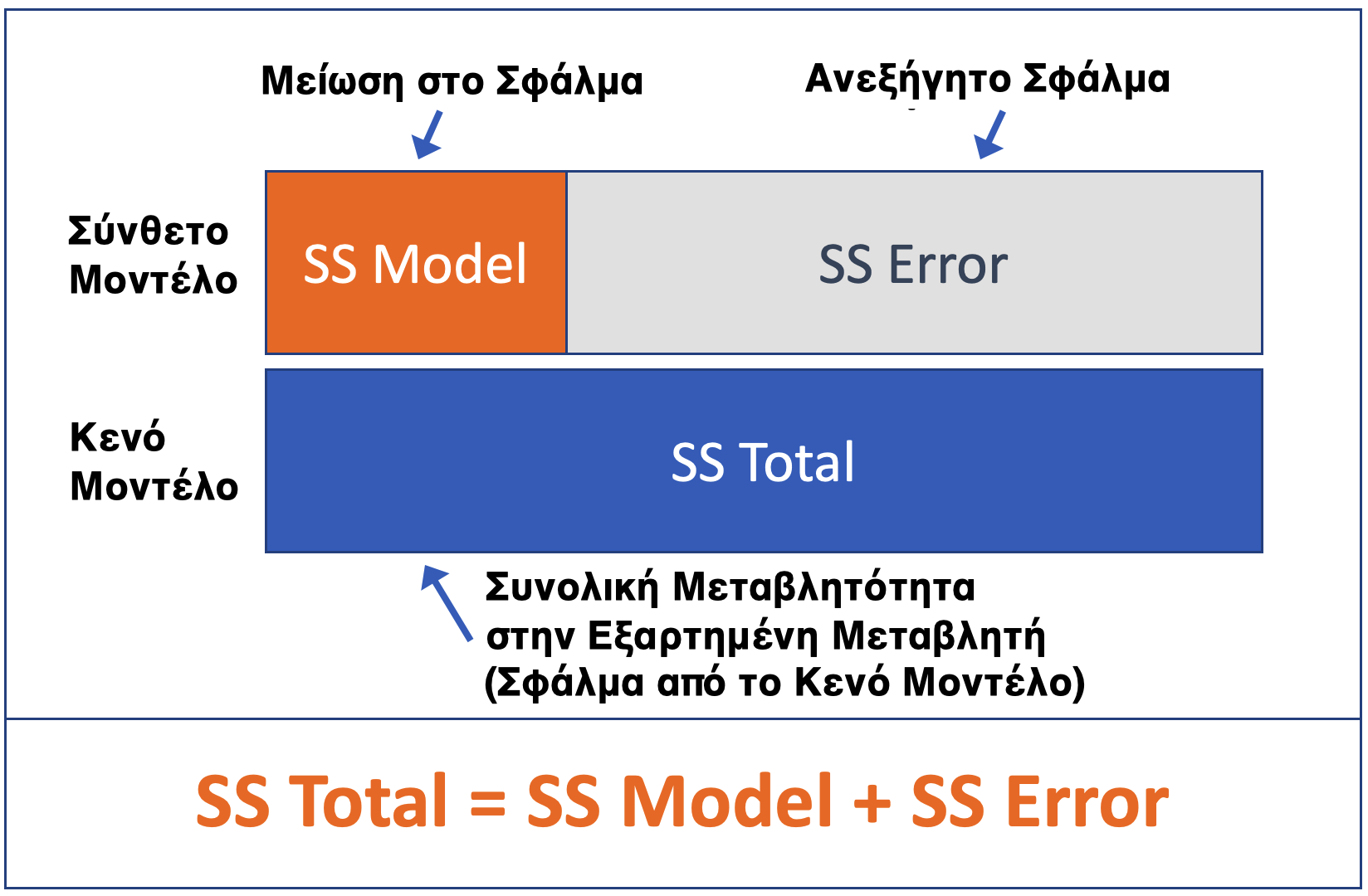 Αν \(b_1 = 0\), το σύνθετο μοντέλο δεν προσφέρει καμία βελτίωση έναντι του κενού μοντέλου — οι προβλέψεις του είναι πανομοιότυπες. Άρα το SS Model = 0, και επομένως: